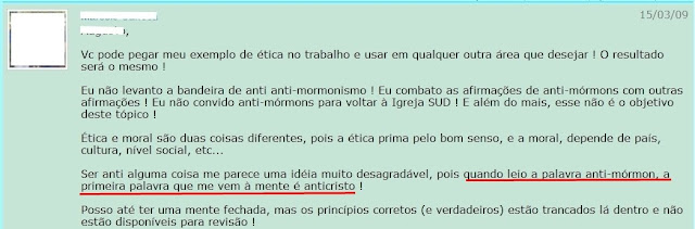 Investigadora: até desconfio qual seja a comunidade do Orkut dessas postagens, onde uma(s) determinada (as) pessoa (as) se considera (am) igual a Deus, imagine só: o pobre ser mortal, que come, que faz necessidades fisiológicas e que morre, se comparar ao Deus supremo! Só na mente fanática dos mórmons mesmo. Eles alegam que sabem tudo, conhecem tudo e podem julgar quem quiser, sem se importarem com a honra e a dignidade das pessoas. Assim agem os fanáticos de plantão. O direito de criticar, de ir e vir (entrar e sair em uma instituição religiosa) está garantido pela constituição.